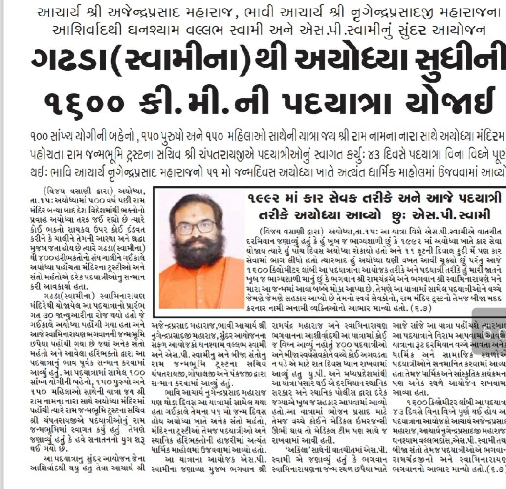 ગઢડાથી છપૈયા જતા અયોધ્યામાં પ. પૂ. લાલજીમહારાજશ્રીએ ધૂળેટીના પાવન પર્વે પદયાત્રીઓને દર્શન-આશીર્વચન આપ્યા હતા.